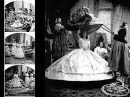 No obstante, hacia 1850 los vestidos pesan tanto y están tan ajustados a la cintura creando la figura del reloj de arena (momento de plenitud) que se decide rebajar el número de enaguas y conseguir el mismo volumen que se conseguía gracias a éstas con un armazón que abullona exageradamente la falda. Estamos hablando de la crinolina (llamada así porque las varillas se hacían con crines de caballo) o el miriñaque.